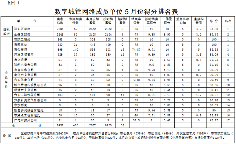依据《六安市数字化城市管理考评办法》(六政办[2015]93号),现将各网络成员单位5月份数字化城市管理案件办理和考评得分情况通报如下: