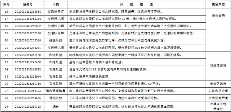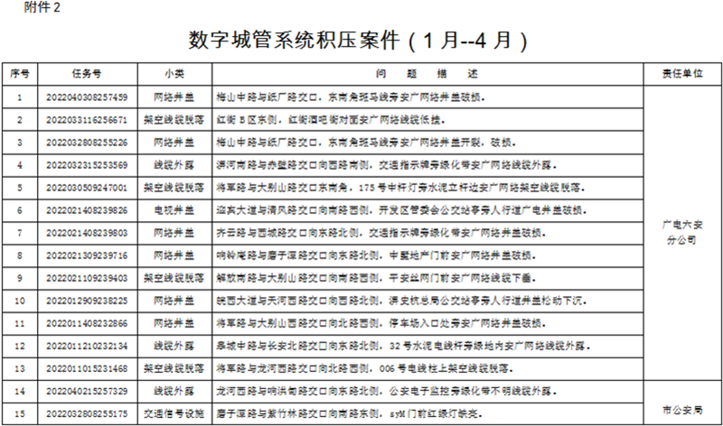 1.广电六安分公司:(1)周集路与淠河北路交口东北角,碧桂园天玺广告牌旁,广电网络井盖破损。(2)将军路与横排头路交口向南路西侧,173-092号路灯杆旁绿化带安广网络线缆外露。(3)皖西大道与长安北路交口西北角,斑马线旁人行道安广网络线缆外露。(4)振星路与劝学路交口向西路北侧,龙腾影相向西绿地内安广网络线缆外露。(5)文华路与皋星巷交口向西路南侧,水煮鱼乡门前施工占道。(6)大别山路与紫荆路交口西北角,东成专业电动工具前井盖破损。(7)清水河路与九里沟路交口向西路南侧,六安市清水河学校初中部北大门两旁人行道两个弱电井盖破损。(8)霍山路与龙井沟路交叉口人行道方形井盖丢失。(9)淠河北路与刘大园路交口向南路西侧,淠河北路刘大园路口4号公交站台旁人行道上井盖破损。(10)长安北路与梅山北路交口向南路东侧,淠绿新村南大门旁人行道上井盖井沿损坏。(11)解放北路与姚李路交口向北路西侧,友好宾馆门前有线电视井盖破损。(12)文华路与梅山北路交口向东路南侧,文华路135号门前人行道上网络井盖破损。(13)和谐西路与南屏路交口向北路西侧,路标志牌旁网络线缆脱落。(14)姚李路与解放北路交口向西路南侧,冯军中医诊所前人行道上井盖破损。(15)人民东路与八公山北路交口向东路南侧,中国建设银行前施工占道。