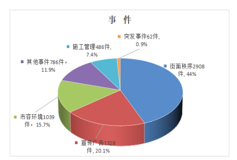 事件类问题6609件,占问题总数68.99%。其中:街面秩序类2908件,占事件类总数44.0%;宣传广告类1328件,占事件类总数20.1%;市容环境类1039件,占事件类总数15.7%;其他事件类786件,占事件类总数11.9%;施工管理类486件,占事件类总数7.4%;突发事件类62件,占事件类总数0.9%。