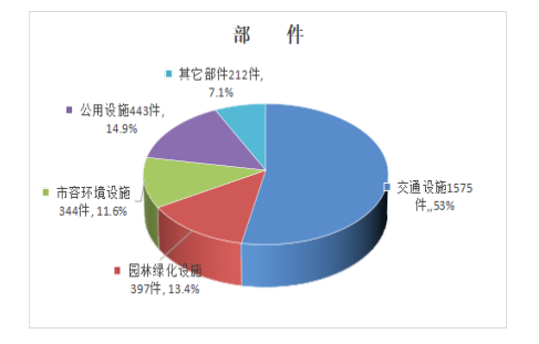 部件类问题2971件,占问题总数31.01%。其中:交通设施类1575件,占部件类总数53%;公共设施类443件,占部件类总数14.9%;园林绿化设施类397件,占部件类总数13.4%;市容环境设施类344件,占部件类总数11.6%;其他部件类212件,占部件类总数7.1%。