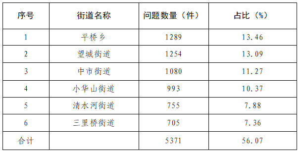 多发区域主要集中在平桥乡、望城街道、中市街道、小华山街道、清水河街道、三里桥街道,共计采集问题5371件,占问题总数的56.07%。详细数据见下表: