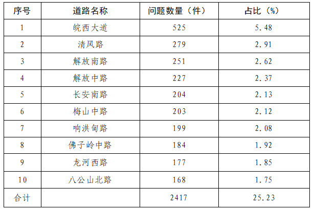 多发路段主要集中在皖西大道、清风路、解放南路、解放中路、长安南路、梅山中路、响洪甸路、佛子岭中路、龙河西路、八公山北路,共计采集问题2417件,占问题总数的25.23%。详细数据见下表: