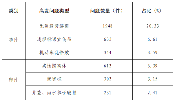 事件高发问题前三为无照经营游商、违规标语宣传品、机动车乱停放;部件高发问题前三为柔性隔离体、便道桩、井盖、雨水箅子破损。详细数据见下表: