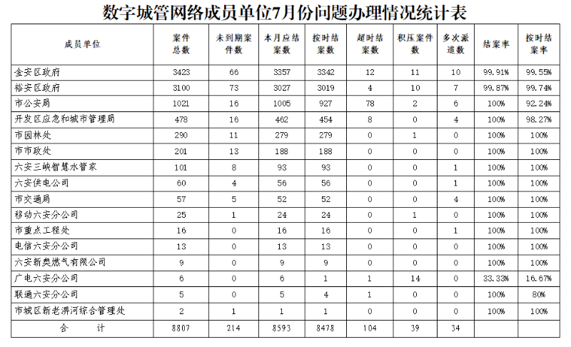 为便于数字城管网络成员单位掌握问题办理情况,提升办理质效,现将7月份数字城管运行情况通报如下: