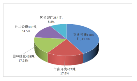 部件类问题2650件,占问题总数28.14%。其中:交通设施类1108件,占部件类总数41.8%;市容环境设施类467件,占部件类总数17.6%;园林绿化设施类458件,占部件类总数17.3%;公共设施类383件,占部件类总数14.5%;其他部件类234件,占部件类总数8.8%。