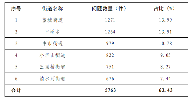 多发区域主要集中在望城街道、平桥乡、中市街道、小华山街道、三里桥街道、清水河街道,共计处置问题5763件,占问题总数的63.43%。详细数据见下表: