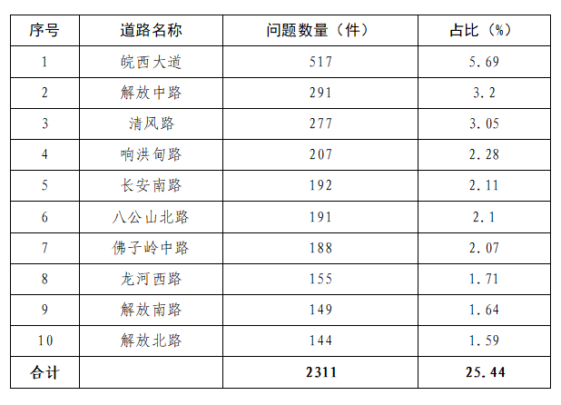 多发路段主要集中在皖西大道、解放中路、清风路、响洪甸路、长安南路、八公山北路、佛子岭中路、龙河西路、解放南路、解放北路,共计处置问题2311件,占问题总数的25.44%。详细数据见下表: