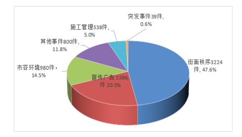 事件类问题6767件,占问题总数71.86%。其中:街面秩序类3224件,占事件类总数47.6%;宣传广告类1386件,占事件类总数20.5%;市容环境类980件,占事件类总数14.5%;其他事件类800件,占事件类总数11.8%;施工管理类338件,占事件类总数5.0%;突发事件类39件,占事件类总数0.6%。