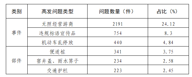 事件高发问题前三为无照经营游商、违规标语宣传品、机动车乱停放;部件高发问题前三为便道桩、窨井盖、雨水箅子、交通护栏损坏。详细数据见下表: