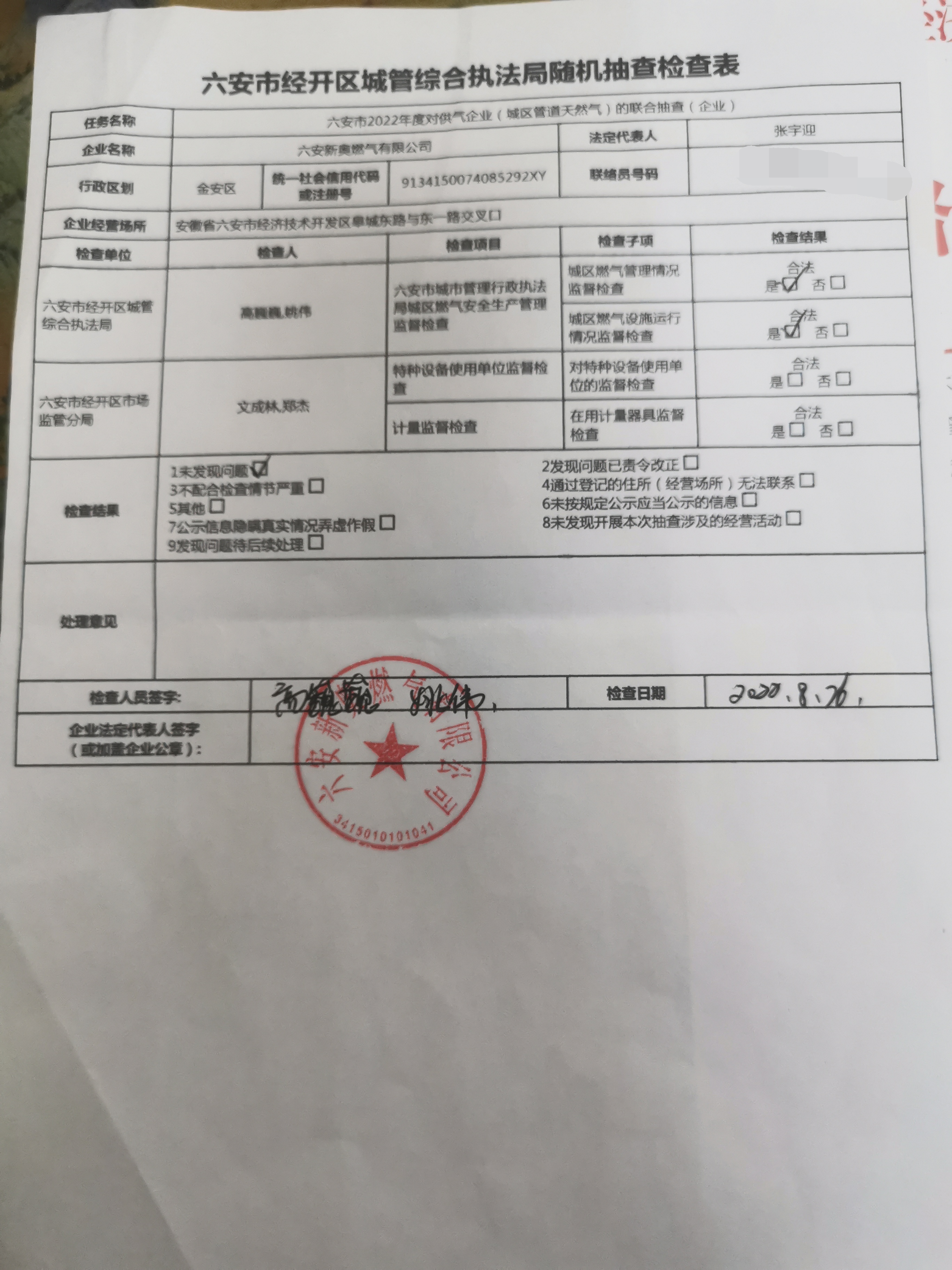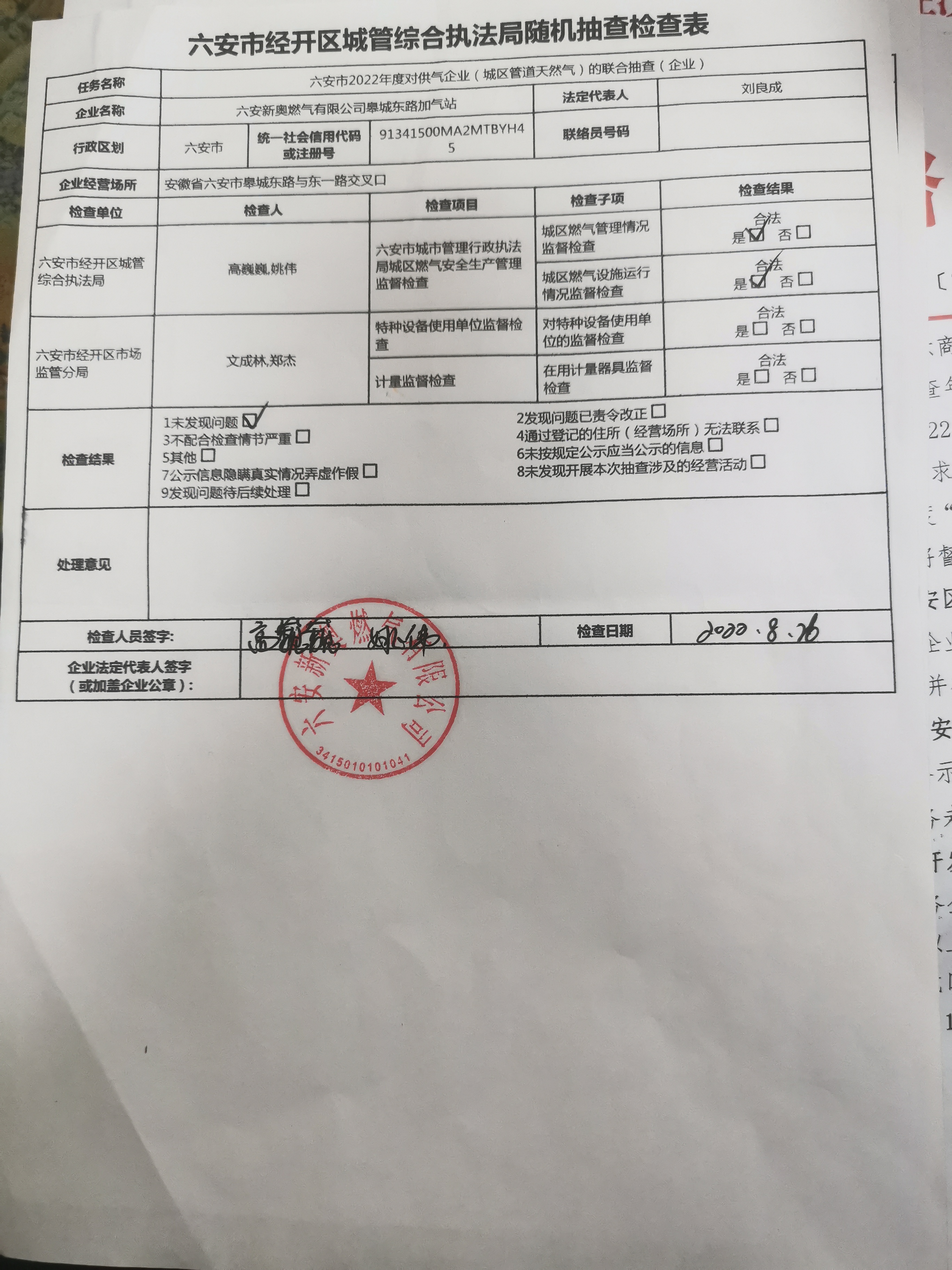 六安市经开区城管综合执法局2022年“双随机、一公开”抽查结果公开(燃气)