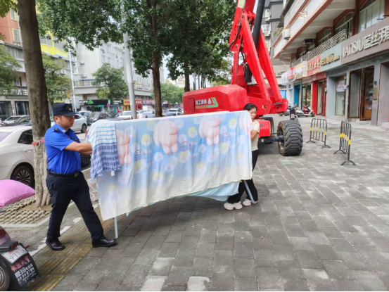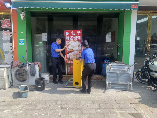 沿街晾晒、出店经营、违规广告牌是影响市容市貌的常见问题。执法人员对辖区内沿街商户、居民小区周边的违规晾晒行为及时劝阻,协助居民将衣物等物品转移至指定晾晒区域;对出店经营、占道堆放的物品,协助责任人现场清理,恢复道路公共空间功能;对违规设置的占道广告牌,依法进行清理,累计清理各类违规广告牌20余块,让街面“清爽”起来。