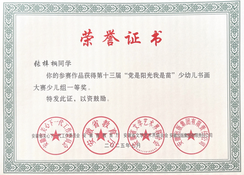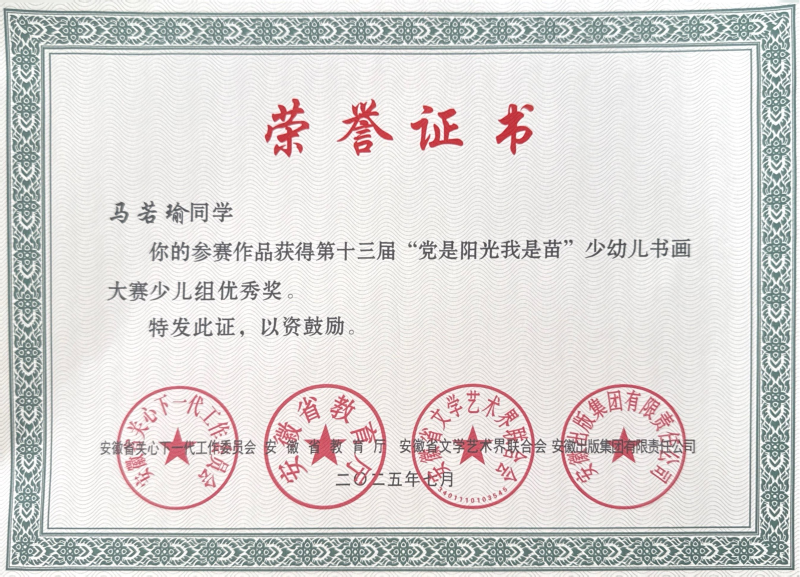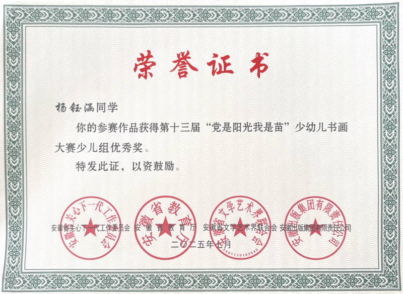 近日,由省关工委、省教育厅、省文联、安徽出版集团联合主办的第十三届“党是阳光我是苗” 少幼儿书画大赛落下帷幕。在本届大赛中,经过市、省两级层层严格选拔,我局共有 3 名职工子女在众多优秀参赛选手中脱颖而出,1人获省级一等奖,2人获省级优秀奖。