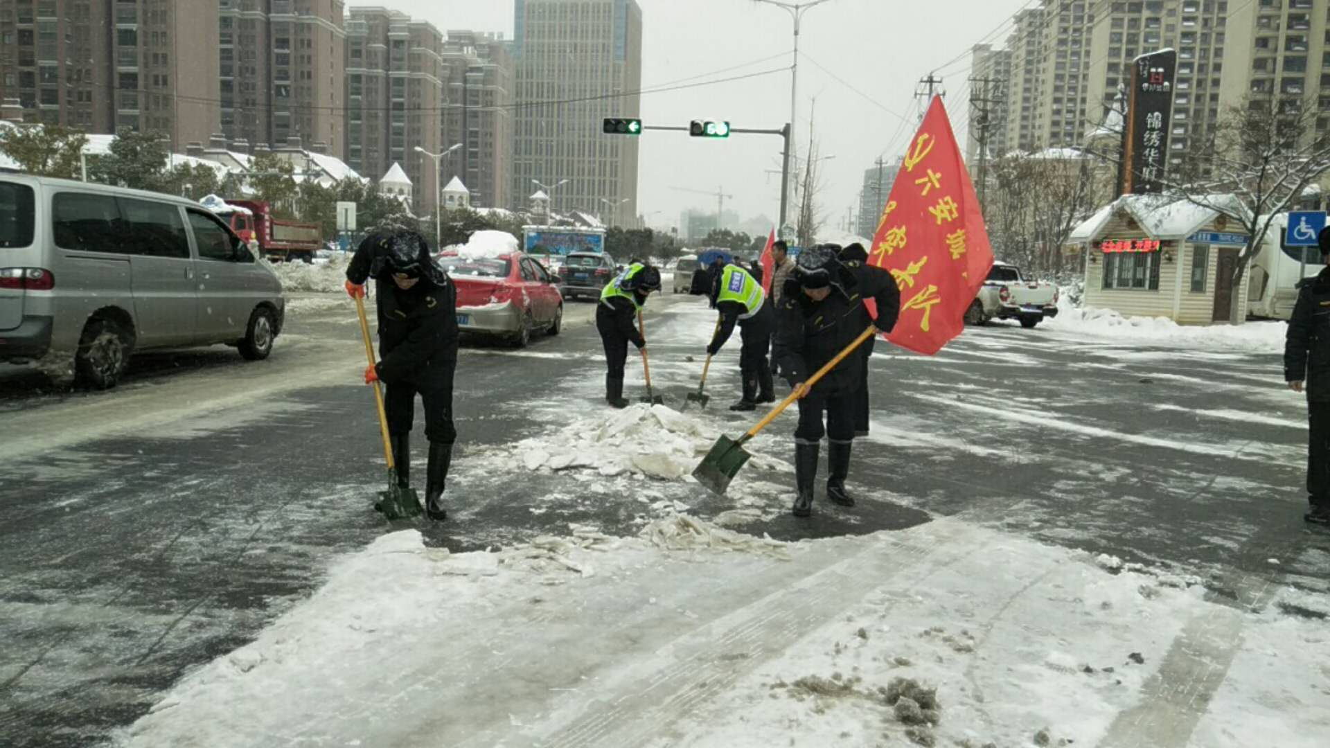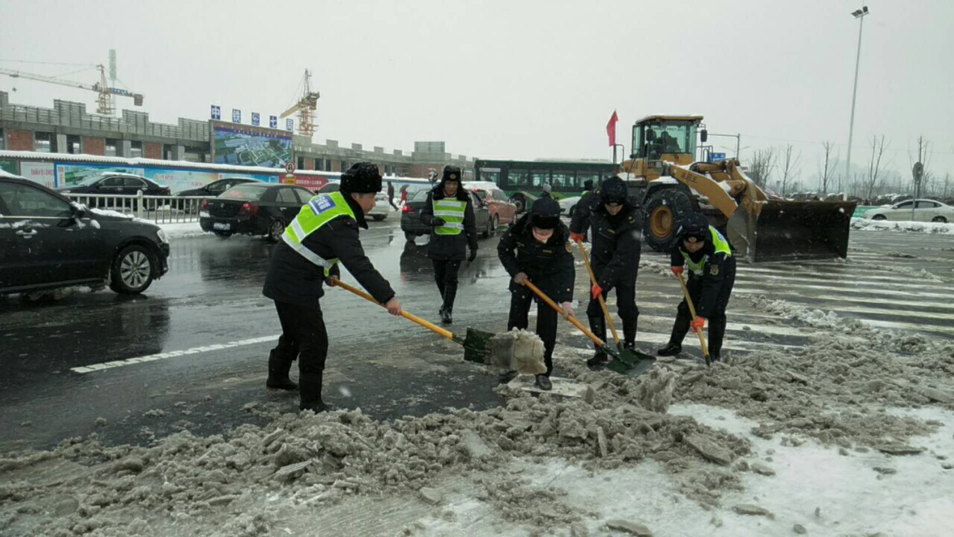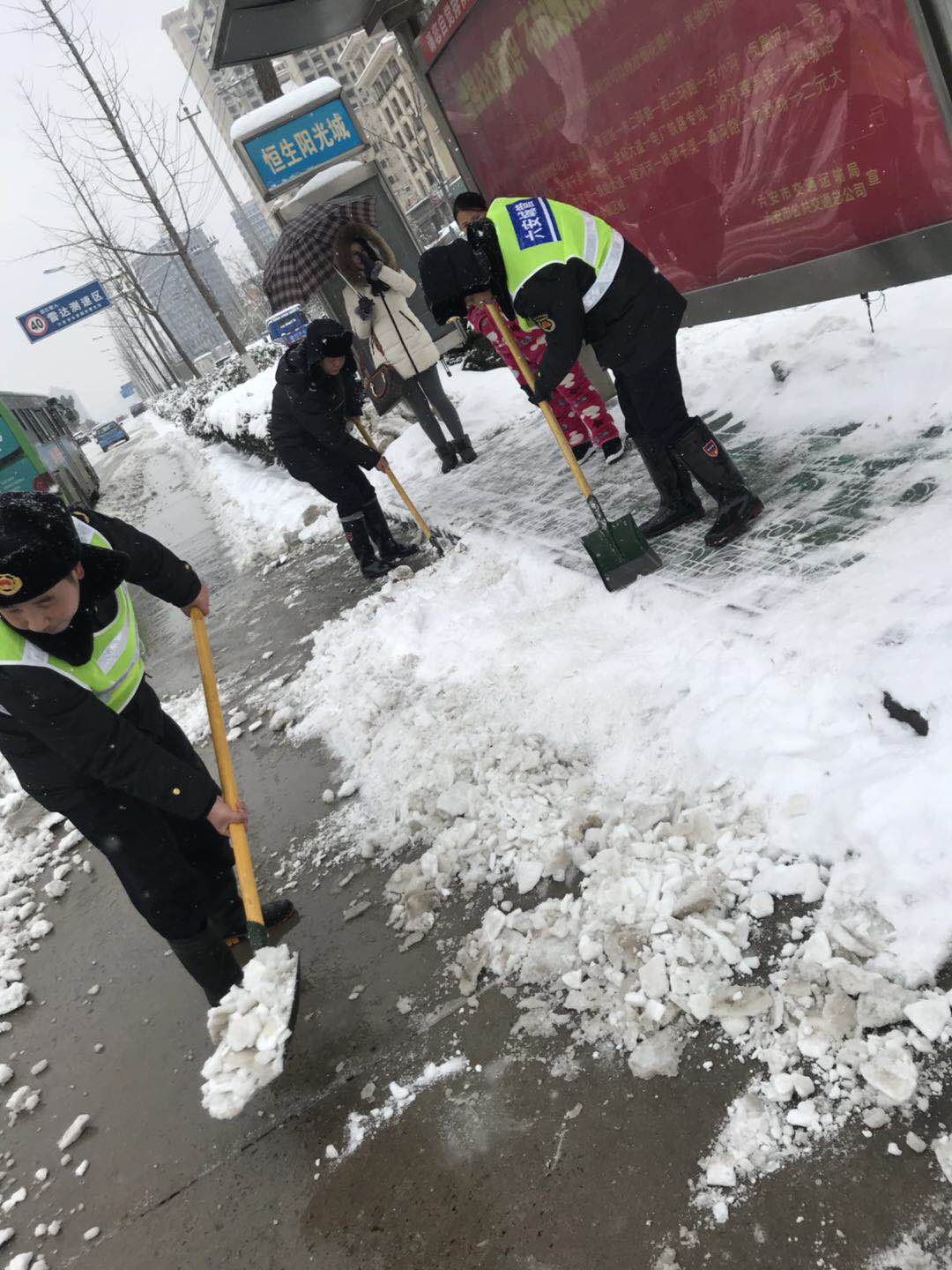 “除雪是义务,行动是责任”,市容支队的领导们身先士卒,第一时间冲在扫雪前线,铲雪过程中,有的地方结成冰,贴在地面很难清理,领导干部就带领队员用手中的铁锹一块一块砸,再用手将冰渣掰开,清走。为了提高效率,部分队员“创新”工作方法,找来大木板,将铲出来的雪和冰块堆放在木板上,堆满了一起运走,节省了来回跑的时间。无论是机动车道、人行道、还是公交站台,只要有冰雪之处,大家都会非常细致地将雪除去,确保车行畅通,人行无碍。
