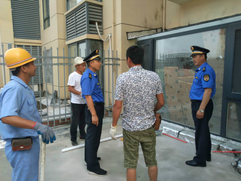 平桥乡五里桥新村属政府新近回迁安置小区,小区内环境优美,配套设施齐全,物业管理规范。近日,小区物业向大队反映,位于该小区3号楼和4号楼两户二楼业主私自占用公共平台,正在违规搭建“阳光房”。大队立即安排执法队员到现场进行查看和处置。