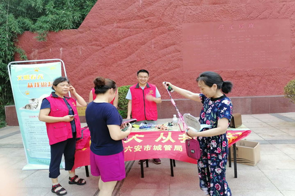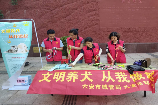 8月3日下午,市环卫处志愿服务队员在烈士陵园内开展形式多样的“文明养犬 从我做起”宣传活动,发放依法养犬、文明养犬宣传册和牵狗链子,引导市民文明养犬,增强市民文明养犬意识,成效显著。