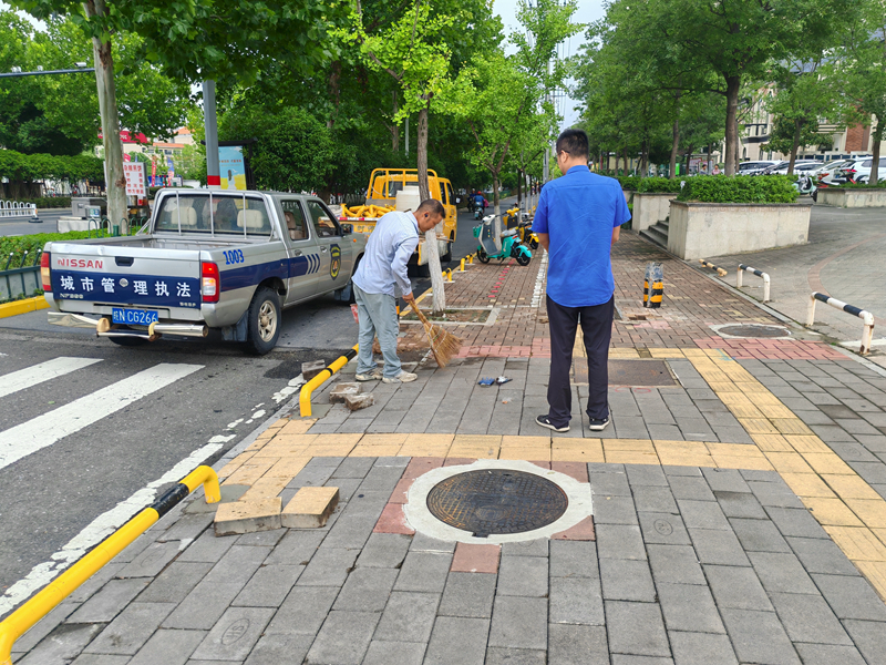 中队执法人员现场确认问题属实后,决定采取物理隔离这一最直接有效的方式,从根源上杜绝乱停乱放。随后,中队联系工人在该路段安装了一排醒目的黄色便道桩,彻底阻断了车辆开上人行道的可能性。这些黄色的桩柱间距经过精心测算,既确保了行人和非机动车的顺畅通行,又完全阻挡了机动车辆的驶入。