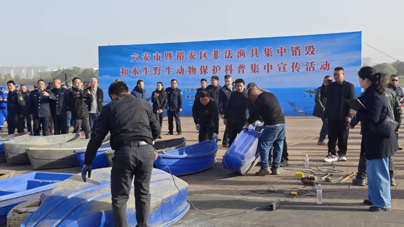 本次活动由市农业农村局主办,裕安区农业农村局承办,旨对全年依法收缴、暂扣的非法捕鱼设备、禁用网具及违规钓具进行集中拆解销毁。市淠河管理处提交销毁的渔具包括橡皮船1个、钓鱼竿15根、渔网3副,均为执法人员在日常巡查中收缴。活动现场,执法人员代表介绍查获非法渔具的种类、数量及执法案例,工作人员在现场群众、媒体监督和公证机构公正下,通过机械切割、工具拆解等方式集中销毁非法渔具,对非法捕鱼的行为形成有效震慑效果,营造“人人参与禁渔、共同保护生态”的良好社会氛围。