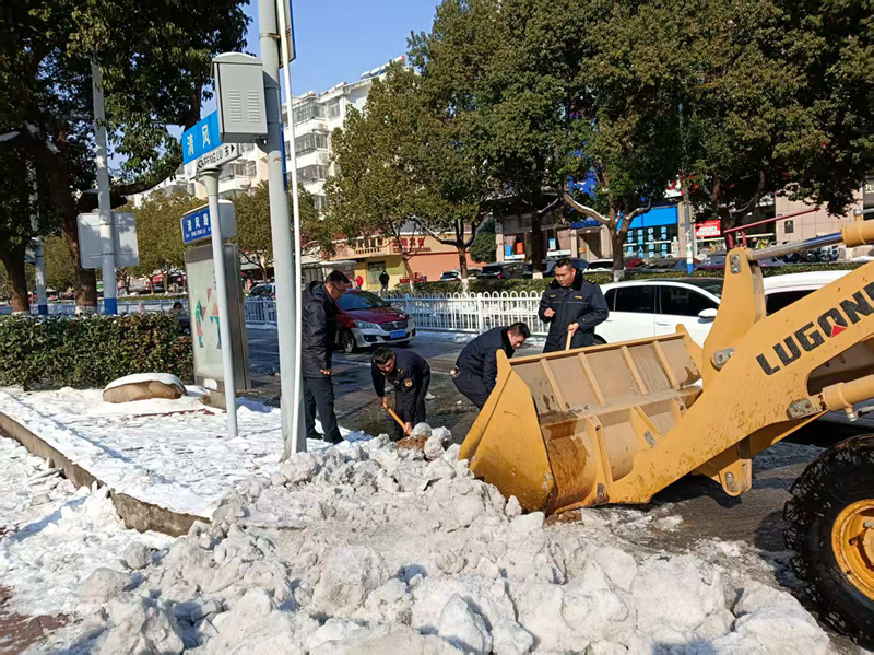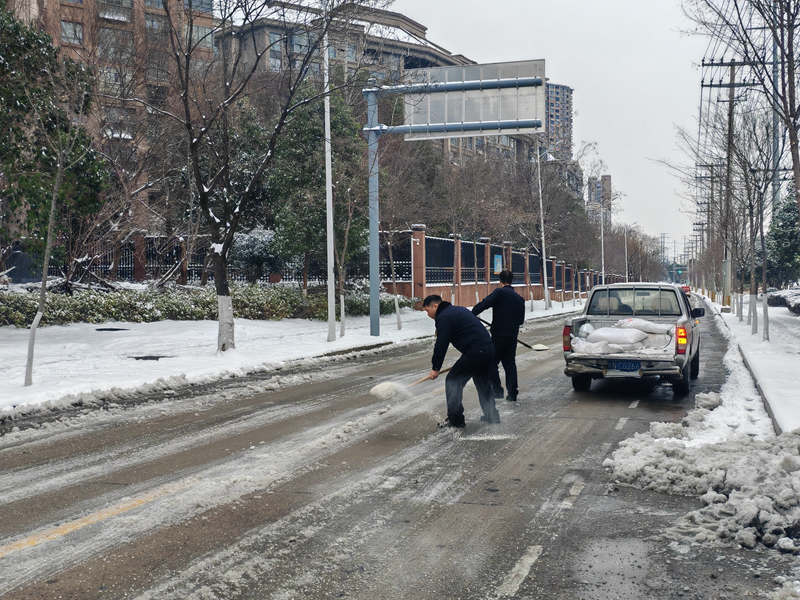 望城中队“以雪为令、闻雪而动”,按照应急预案组织人员,分配装备。采取“机械+人工”组合作业模式清理积雪;重点对辖区主次干道路口、校园周边、公交站台、农贸市场周边等影响市民出行的重要地段实行铲雪除冰工作,并安排夜间值班人员随时响应突发情况。截至目前,望城中队共出动铲雪车3辆,渣土车10辆,执法人员36人,使用融雪剂4吨左右。