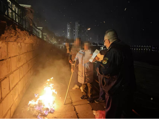 夜幕下,淠河景观带步道上,队员们手持文明祭祀宣传资料逐段巡查,发现焚烧冥纸的市民,耐心宣传、讲解政策,引导采用鲜花祭祀等绿色环保方式寄托哀思。组织各养护企业,增派安保人员手持灭火器、灭火拖把在重点区域值守,制止不文明祭祀行为,及时发现消除火情,确保无安全隐患。自一月以来,发放宣传单200余份,制止焚烧冥纸170起,该专项行动将一直持续到春节假期结束。