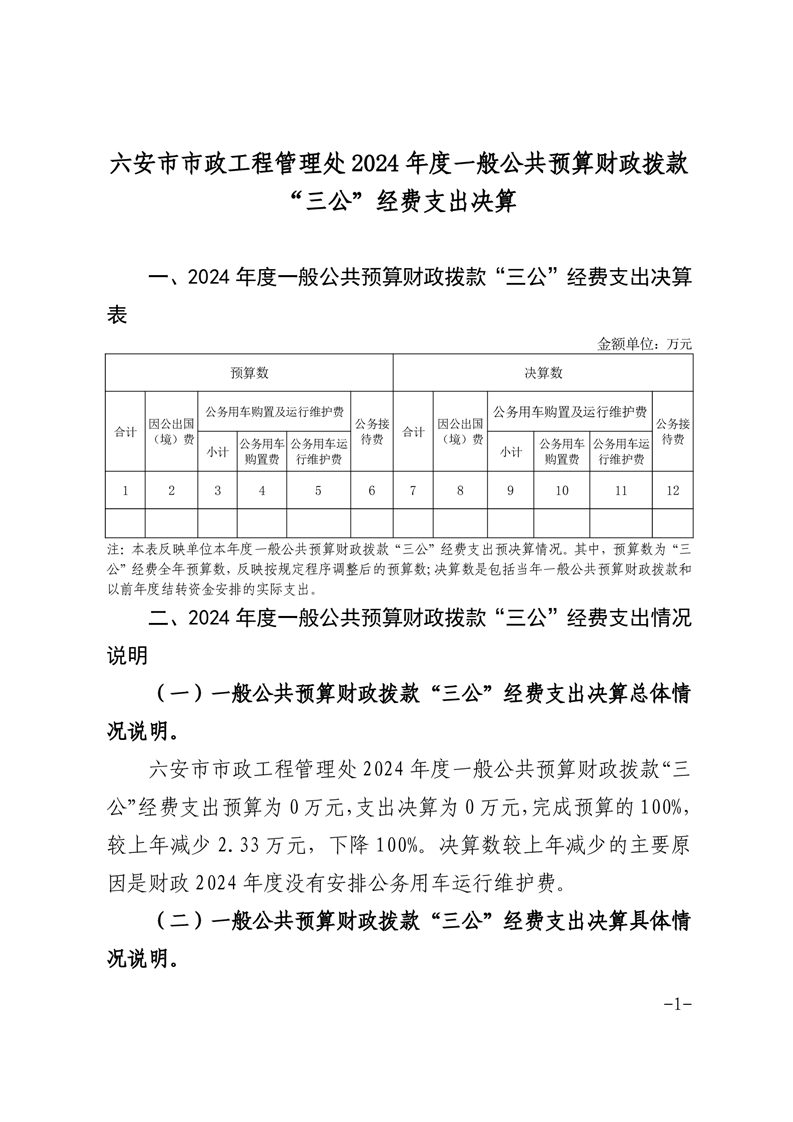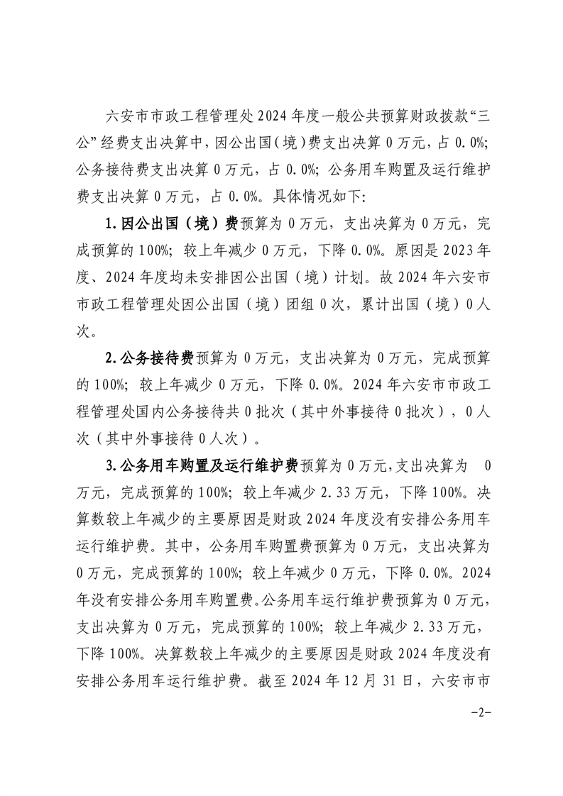 六安市市政工程管理处2024年度一般公共预算财政拨款“三公”经费支出决算