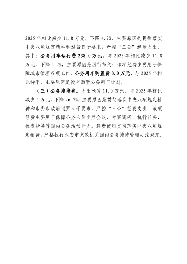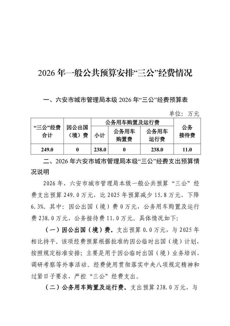 六安市城市管理局本级2026年一般公共预算安排“三公”经费情况